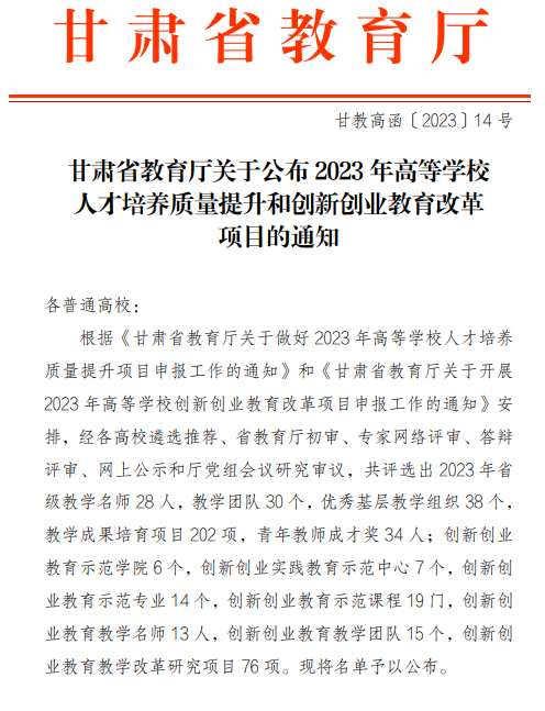 近日,甘肃省教育厅下发了《关于公布2023年高等学校人才培养质量提升和创新创业教育改革项目的通知》(甘教高函〔2023〕14号),Beat365共有17个项目获省级立项,其中,叶淑媛教授、王成德教授获省级教学名师荣誉称号,杨惠教授获青年教师成才奖荣誉称号,“电子信息工程专业课程教学团队”、“传承红色基因特色思政育人—思想政治理论课教学团队” 获批省级教学团队,“化学教研室基层教学组织”获批省级优秀基层教学组织,“人工智能背景下财务管理专业人才培养模式改革与创新研究”等6项项目获批省级教学成果培育项目,“雁苑微林众创空间-化工学院校企合作子空间”获批省级创新创业实践教育示范中心,《数字电子技术基础》获批省级创新创业教育示范课程,“基于创新创业教育理念的《中级财务会计》课程专创融合教学模式改革研究”等3项项目获批省级创新创业教学改革项目。