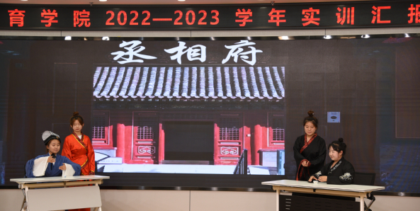 根据实训内容的不同,本次汇报分为三个场次。第一场为学前教育与小学教育专业进行童话剧、课本剧表演汇报。同学们用丰富的体态语言、生动的表情语言、富有感染力的口头语言,充满默契的合作,重现了书本中的经典形象和精彩的情节,展示了“教师语言”技能实训的效果。第二场由学前教育专业进行幼儿园五大领域主题试教汇报,展现同学们的教学设计及教学能力实训成果。第三场为数学与应用数学专业的同学们展现“三笔字”、“说课与讲课”及“教学评价与教学研究论文写作”等专业能力实训成效。各专业负责人进行了汇报点评与总结。