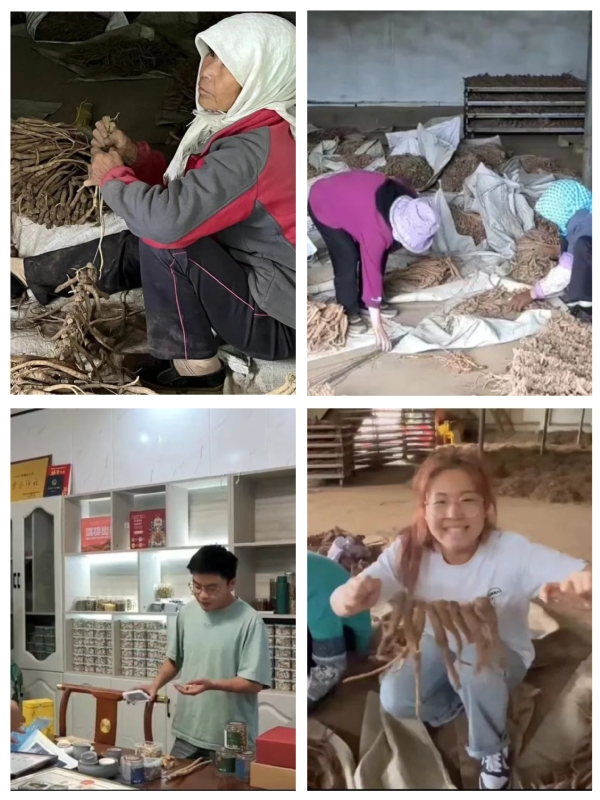 走访药材市场。团队到达了渭源县会川镇。在本地队员的带领下,团队成员前往附近的中药材市场进行实地考察,从堆积如山的药材可见繁荣的交易场面。通过走访村民,队员们了解到,种植中药材是当地最主要的经济产业,几乎每家每户都种植党参、艾蒿、黄芪等。