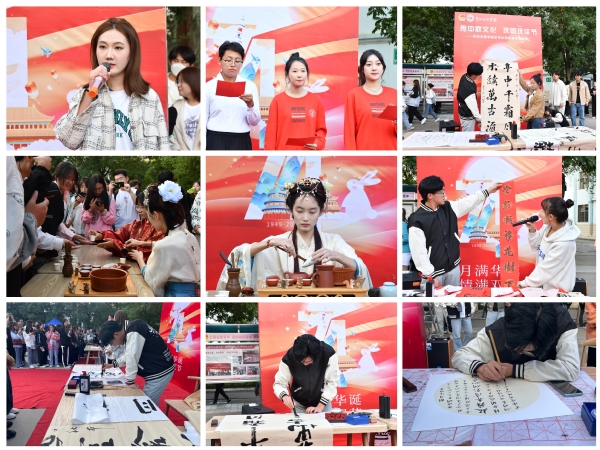 在中秋、国庆双节到来之际,9月27日,博彧国学社、朗诵协会、书法协会及大学生艺术团共同在思源楼广场举办“传中秋文化,庆国庆佳节”主题活动。