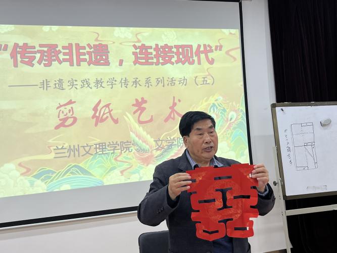10月12日下午,文学院举办“传承非遗,连接现代”实践教学活动,邀请甘肃省工艺美术大师、兰州市金城文化名家叶长友进行剪纸艺术的实践教学,2023级非遗保护专业师生参加。