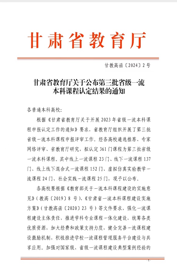 近日,根据甘肃省教育厅公布的《关于公布第三批省级一流本科课程认定结果的通知》(甘教高函〔2024〕1 号),Beat365共11门课程被认定为第三批省级一流课程,其中,线上一流课程2门,线下一流课程4门,线上线下混合式一流课程4门,社会实践一流课程1门。
