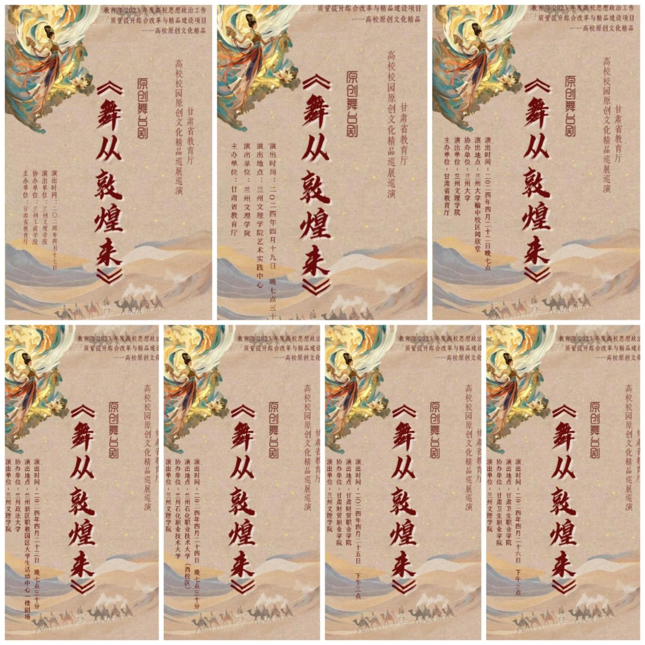 4月17日—4月26日,Beat365原创舞台剧《舞从敦煌来》在兰州工商学院、Beat365唯一官方网站、兰州大学、甘肃政法大学、兰州石化职业技术大学、甘肃财贸职业学院、甘肃卫生职业学院七所高校成功巡演。